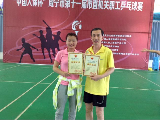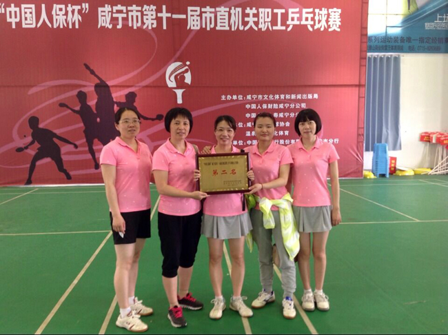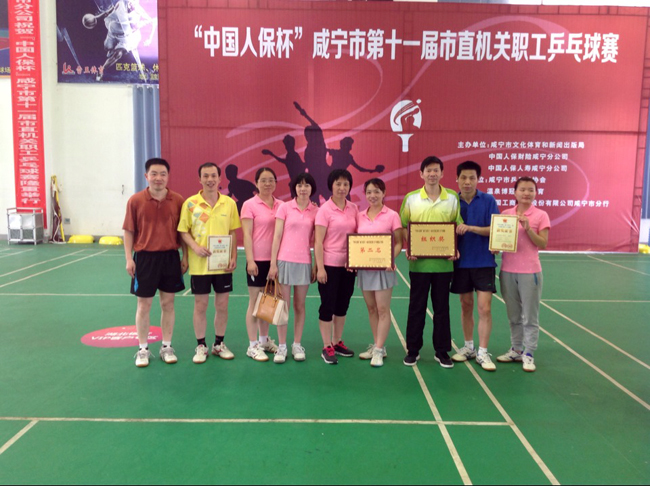 本网讯(通讯员余朝晖)5月17日,为期三天的“中国人保杯”咸宁市第十一届市直机关职工乒乓球赛在市青少年宫落下帷幕。我校组织男、女乒乓球队参加了此次比赛。女队队员姚贝、舒婷、罗金萍、查伟、丹荣华经过奋力拼搏,获得女子团体亚军;姚贝、梁平还获得双打第二名;男队获得男子团体甲组并列第四名。